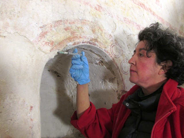 Los dos restauradores, contratados por el Ministerio de Cultura, han diagnosticado el estado de conservación de las pinturas, y en una segunda fase, han limpiado y saneado las paredes, decoradas al fresco y maltratadas por siglos de indiferencia. Bajo sus bisturís y sus ultrasonidos, las antiguas pinturas que Menéndez Pidal descubrió al retirar el retablo central aparecen de nuevo, con la viveza que tuvieron entonces.