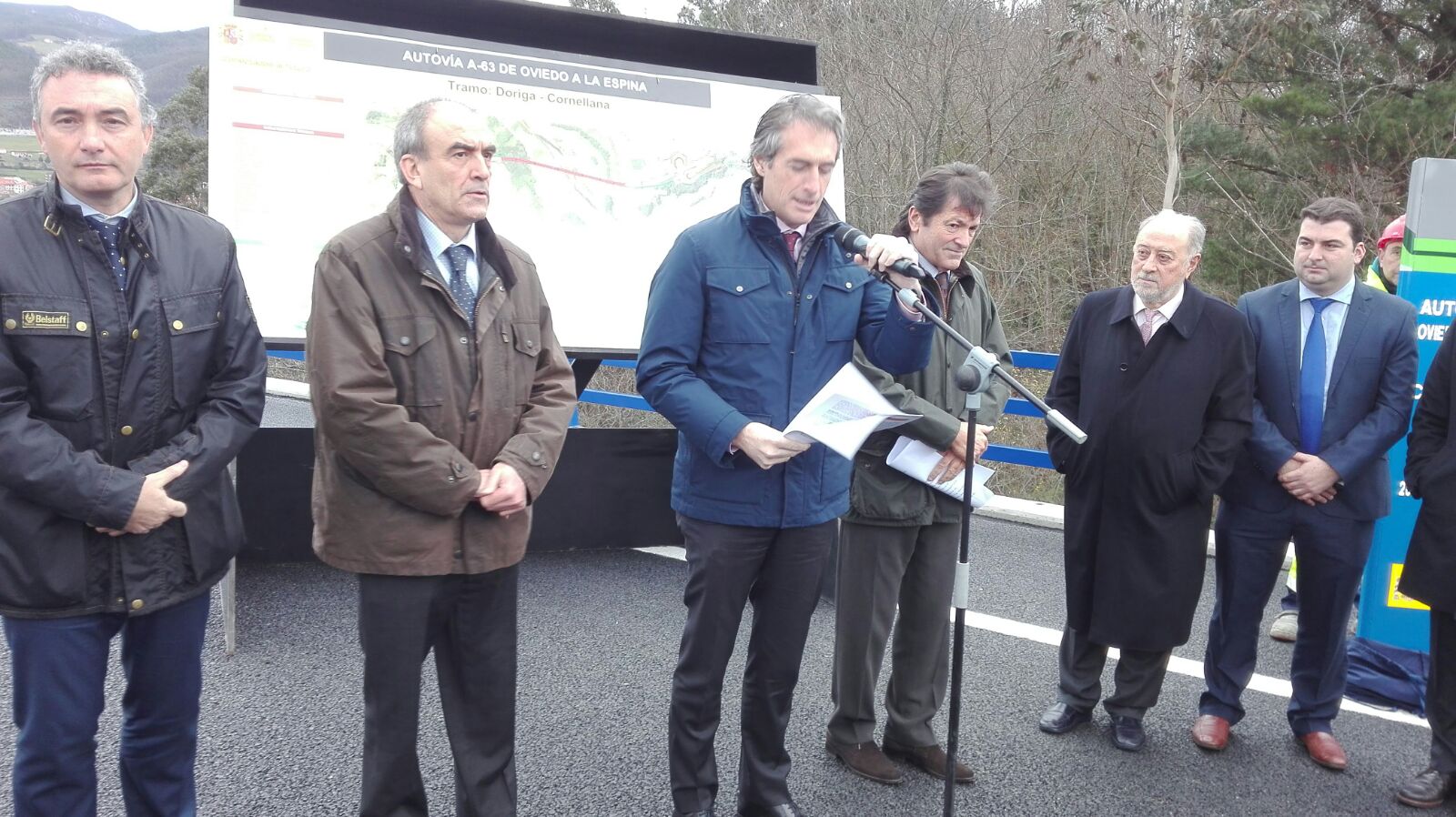 El ministro de Fomento Íñigo de la Serna acaba de inaugurar oficialmente el tramo de la autovía que va desde Doriga a Cornellana. La construcción de la autovía A-63 sufrió un parón casi completo a raíz de la crisis económica, y su construcción se ha relanzado en esta legislatura. El tramo que ahora se inaugura tiene una longitud de 2,4 kilómetros, y conecta por fin el concejo de Salas con la red estatal de autovías. El siguiente tramo, Salas-Cornellana, con unos 6 kilómetros de longitud, estaba pendiente de una modificación del proyecto, según aseguró De la Serna en una visita a Avilés el pasado mes de septiembre, cuando anunció que esperaba licitar antes de fin de año el tercer tramo, Salas-La Espina. De la Serna dice que las obras continuarán hasta 2020, fecha en la que está previsto abrir el siguiente tramo hasta Salas. A la inauguración asistieron además del ministro, el presidente del Principado Javier Fernández, el alcalde de Salas Sergio Hidalgo y el delegado del Gobierno en Asturias, Gabino de Lorenzo. El alcalde de Salas declaró a La Voz del Trubia que este tramo es un paso más en el progreso para el suroccidente de Asturias.