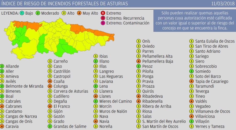 El Instituto de Recursos Naturales y Ordenación del Territorio (Indurot) alerta de que la mayor parte del Camín Real se encuentra en situación de riesgo ‘alto’ de incendios forestales este fin de semana. Una situación en la que se encuentran también muchos otros municipios del Principado de Asturias y que obliga a extremar las precauciones.