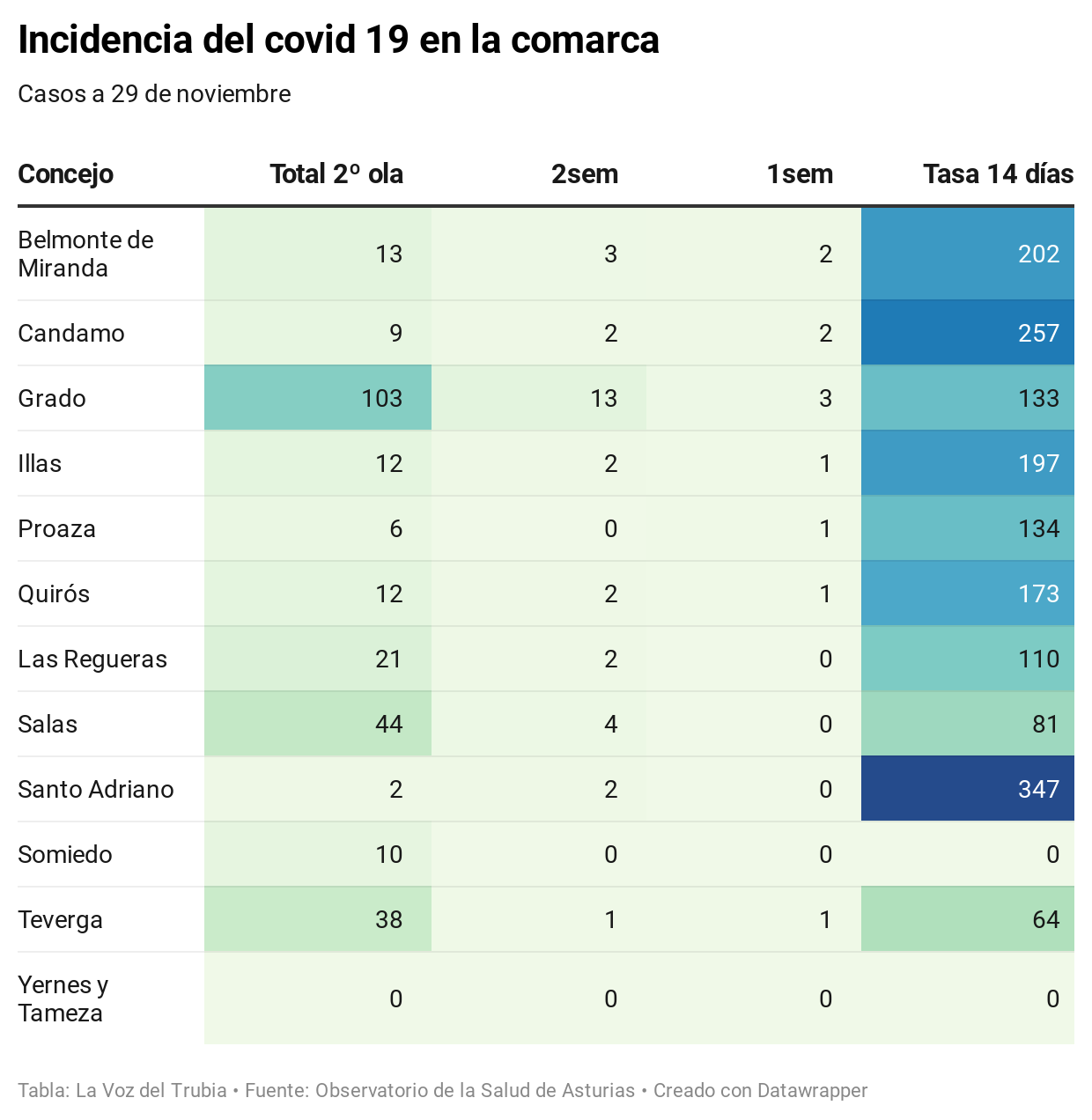 Las medidas drásticas de contención de la pandemia decretadas por el Gobierno regional comienzan a dar frutos en la comarca del Camín Real, donde la pandemia se frena y todos los concejos salen de la zona roja de riesgo extremo, con tasas de incidencia por debajo de los 400 casos por cien mil habitantes. A la cabeza de esta tasa está Santo Adriano, con solo dos casos en la segunda ola, pero cuya tasa se eleva por su escasa población. En Las Regueras, donde el brote fue muy fuerte en el arranque de noviembre, la tasa en los últimos 14 días se sitúa en 110 casos por 100.000 habitantes, con solo dos nuevos positivos. Sí se eleva ligeramente en Candamo, con nueve casos en la segunda ola, dos de ellos en la última semana, mientras que en Somiedo no se detectan casos en los últimos 14 días. Teverga, que sufrió con dureza la segunda ola, ha doblegado la tasa de incidencia, que es de 64 casos por 100.000 habitantes.
