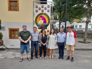 César Castaño, presidente de la Asociación de Bateadores de Oro Barciaecus; José Ramón Feito, alcalde de Tineo; Berta Piñán, consejera de Cultura, Política Llingüística y Turismo , Nuria Iglesias y Javier Nievas, representantes de Caja Rural, y Jarek Dudkiewicz, vicepresidente de la Federación Mundial de Bateadores de Oro