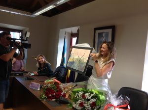 Tras el discurso, Natalia González se fundió en un abrazo con su sucesora y hasta ahora su mano derecha, Marta Menéndez, y recibió numerosos ramos de flores, plantas y obsequios de sus compañeros y los trabajadores municipales, entre ellos un cuadro que reproduce un grabado de la cueva de la Peña, por cuya promoción su equipo ha trabajado mucho.