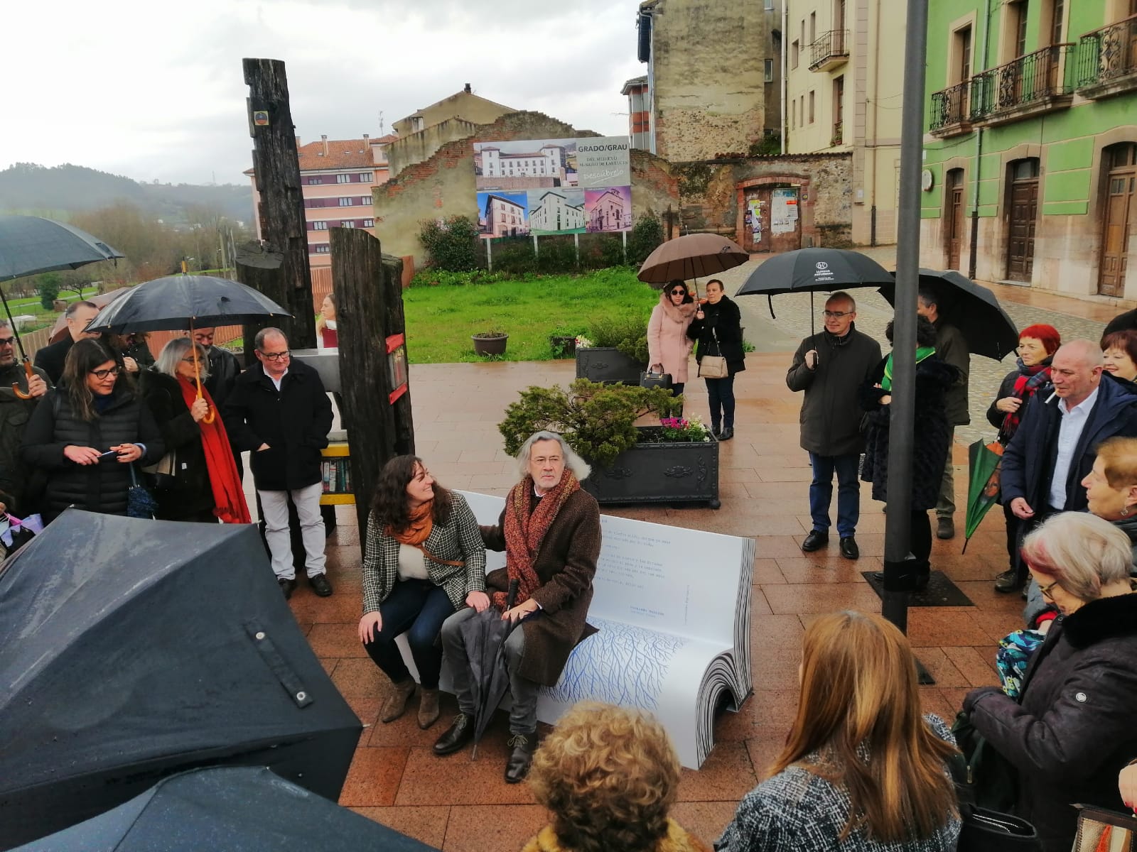 Al final del acto, Fernando, el desapercibido que no pasa desapercibido, a la espera de una sorpresa. Beltrán, sentado en un banco con forma de libro creado para la ocasión, un banco-libro en el que está escrito uno de sus poemas.