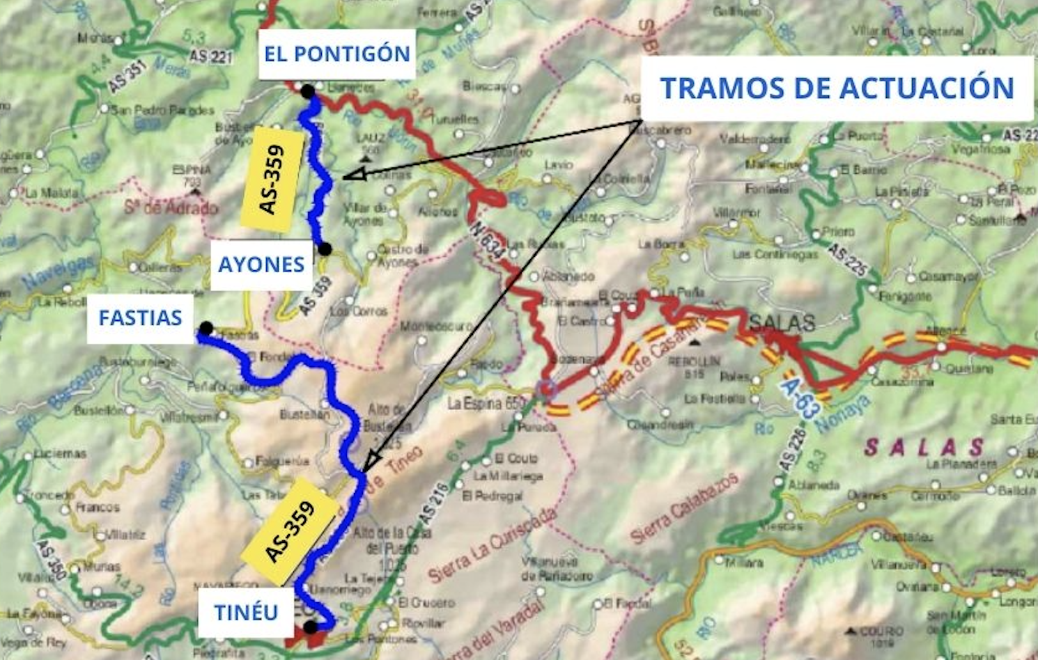 La actuación proyectada se ejecutará en dos tramos, con un total de 19 kilómetros. El primero es El Pontigón – Ayones, entre los puntos kilométricos 0+000 y 5+435, supone actuar en algo más de 5,4 kilómetros, y el segundo, Fastias – Tinéu, en su intersección con la AS-216, carretera La Espina – Tinéu, en unos 13,7 kilómetros aproximadamente que se corresponden con los puntos kilométricos entre el 12+125 y el 25+760. El viceconsejero de Infraestructuras, Jorge García, destaca que se trata de «una obra muy necesaria y que viene recogida en el plan de inversiones del Suroccidente, que contempla 47 actuaciones en 49 carreteras en cinco concejos. Hemos movilizado algo más de 41,5 millones en 44 de estas actuaciones, que están en diferentes estados de ejecución y tramitación».