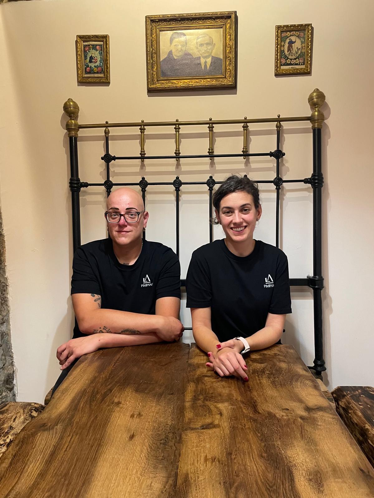 -Ha creado el diseño Elisa Vázquez, una amiga que es diseñadora gráfica y, tanto el diseño como el nombre tienen mucho significado. Pimpana es un adjetivo asturiano que vale para definir una fuente que corre poco y ocurre que, haciendo la obra, apareció un manantial en el baño que retrasó la obra considerablemente, porque fue complicado canalizar el agua y demás. El agua corría muy lenta, era una «fonte pimpana», pero además pimpana/-o tiene una segunda acepción que es “algo de calidad” y esa calidad es la que queremos ofrecer. Vamos a tener un vermú nuestro que se va a llamar “pimpanudo”. El nombre da mucho juego, nuestros clientes también son “pimpanudos”. El logotipo, la imagen es la falda de la montaña, pero también es una montera picona en homenaje a los últimos paisanos que la llevaban Ulpiano de Salceo y tío Agustín “de la rabecha” de Casares, ya pedimos permiso para colgar sus fotos dentro del local.