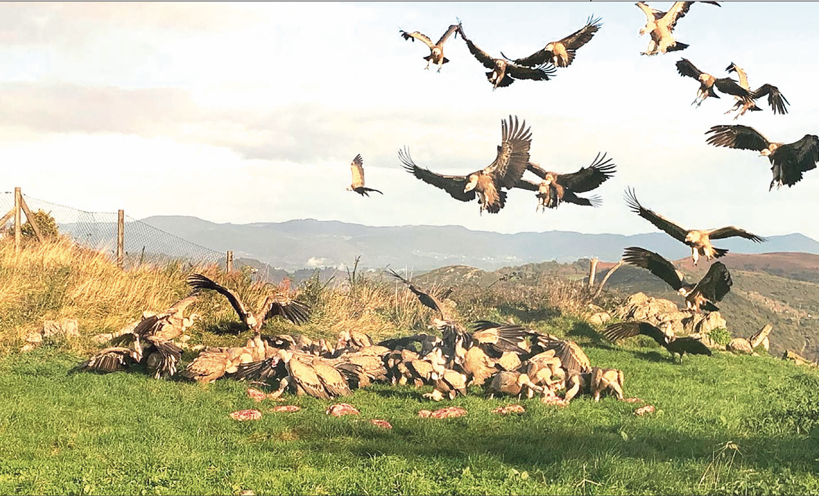 Tras el espectacular aterrizaje, los buitres devoran los restos de carne, los engullen con gran ansiedad para evitar tener que compartir con sus compañeros y poder salir bien alimentados de la visita. En el momento en que se va acabando el manjar, comienza la pugna entre ellos. De hecho, algunas aves de otras especies que llegan también atraídas por el olor, intentan acercarse pero no se atreven por los pleitos que se disputan en este comedero.