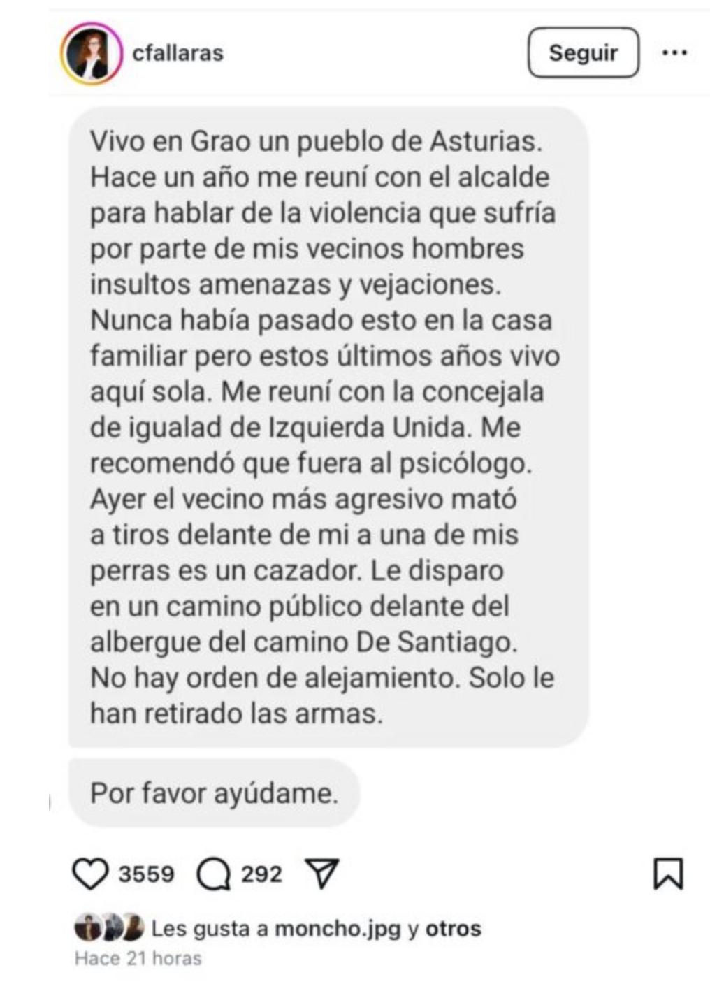 Una vecina de Grado ha denunciado públicamente que desde hace más de un año sufre situaciones de acoso y vejaciones por parte de varios vecinos, hasta el punto de que uno de ellos le pegó un tiro a su perra. El caso ha saltado a las redes a través del canal de denuncias de agresiones a mujeres que tiene habilitado en Instagram la periodista Cristina Fallarás, el mismo que hizo saltar el ‘caso Errejón’. El testimonio publicado por el perfil de la periodista madrileña asegura que la joven lleva meses sufriendo una situación de acoso por parte de varios vecinos, una situación que trasladó al equipo de gobierno y a la concejala de Igualdad, «que me recomendó ir al psicólogo». El equipo de gobierno moscón guarda por el momento silencio ante las acusaciones.