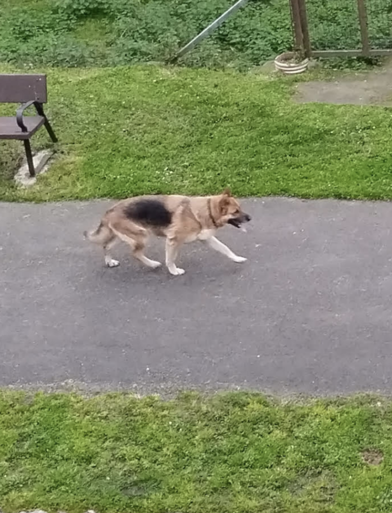 Un perro con aspecto de pastor alemán, bien cuidado, con collar, lleva varios días solo vagando por Trubia. «Se ve muy noble y muy bueno», comentan los vecinos, que piden colaboración por si alguien le reconoce y puede avisar a sus dueños.