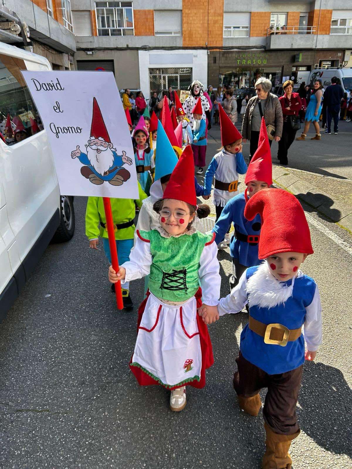 El colegio moscón Virgen del Fresno cumple este año su 50 aniversario, una efeméride que ha inspirado el Antroxu, en el que el centro apostó por recrear los que veían en la tele y en el cine los primeros escolares que se sentaron en sus aulas. La familia Telerín, los Pitufos, David el Gnomo, los Picapiedra, Disney, Dragón Ball, Oliver y Benji, 101 dálmatas, Barrio Sésamo, Cazafantasmas, Tortugas Ninja, fueron algunos de los disfraces grupales, que pudieron verse ayer por la tarde en el desfile por las calles de la villa, acompañados por la Charanga El Alboroto, personal del AMPA y personal de cocina y comedor. Previo al desfile todos los asistentes disfrutaron de una gran chocolatada con churros para coger energía para el desfile que discurrió por Avda Villabella, Bolado, c/Asturias, C/ Cimadevilla, C/Marqueses De la Vega de Anzo y Plaza General Ponte. La directora, paraíso Álvarez Sierra, agradece «la colaboración de las familias y del personal de cocina y comedor que siempre se implica y participa».