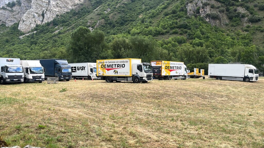 Grandes camiones y autobuses del equipo de rodaje de Los Juegos del Hambre desembarcan en Pola, donde se ha habilitado un estacionamiento privado en una finca