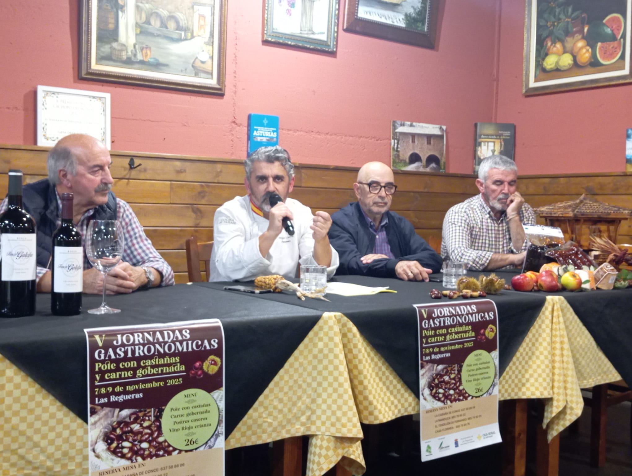 El restaurante El Tendejón de Fernando, de El Escamplero, acogió ayer el pregón de las V Jornadas Gastronómicas del Pote con Castañas, que tendrán lugar el próximo fin de semana coincidiendo con el certamen de la Castaña Valduna. El pregonero fue Miguel Sierra, popular pastelero y cocinero que desde hace tres años preside la Asociación Tarucu, que tiene como fin preservar la memoria histórica del maíz autóctono asturiano. Sierra deleitó con un emotivo pregón sobre la sabiduría popular y la pérdida de los sabores tradicionales, en una presentación que contó con la presencia de Vicente Herranz, concejal de Cultura y Mar García concejala de Juventud, Personal y Nuevas Tecnologías, además de Paco Valdés, presidente de la Asociación para la Recuperación de la Castaña Valduna (Arecasval) y de Fernando Álvarez, presidente de los hosteleros del concejo. Para finalizar el pastelero realizó un original postre, ideado para la ocasión, montado sobre un trozo de madera, una hoja de castaña y estaba compuesto por castaña,maíz crujiente , crema de maíz y arroz con leche, manzana y chocolate.