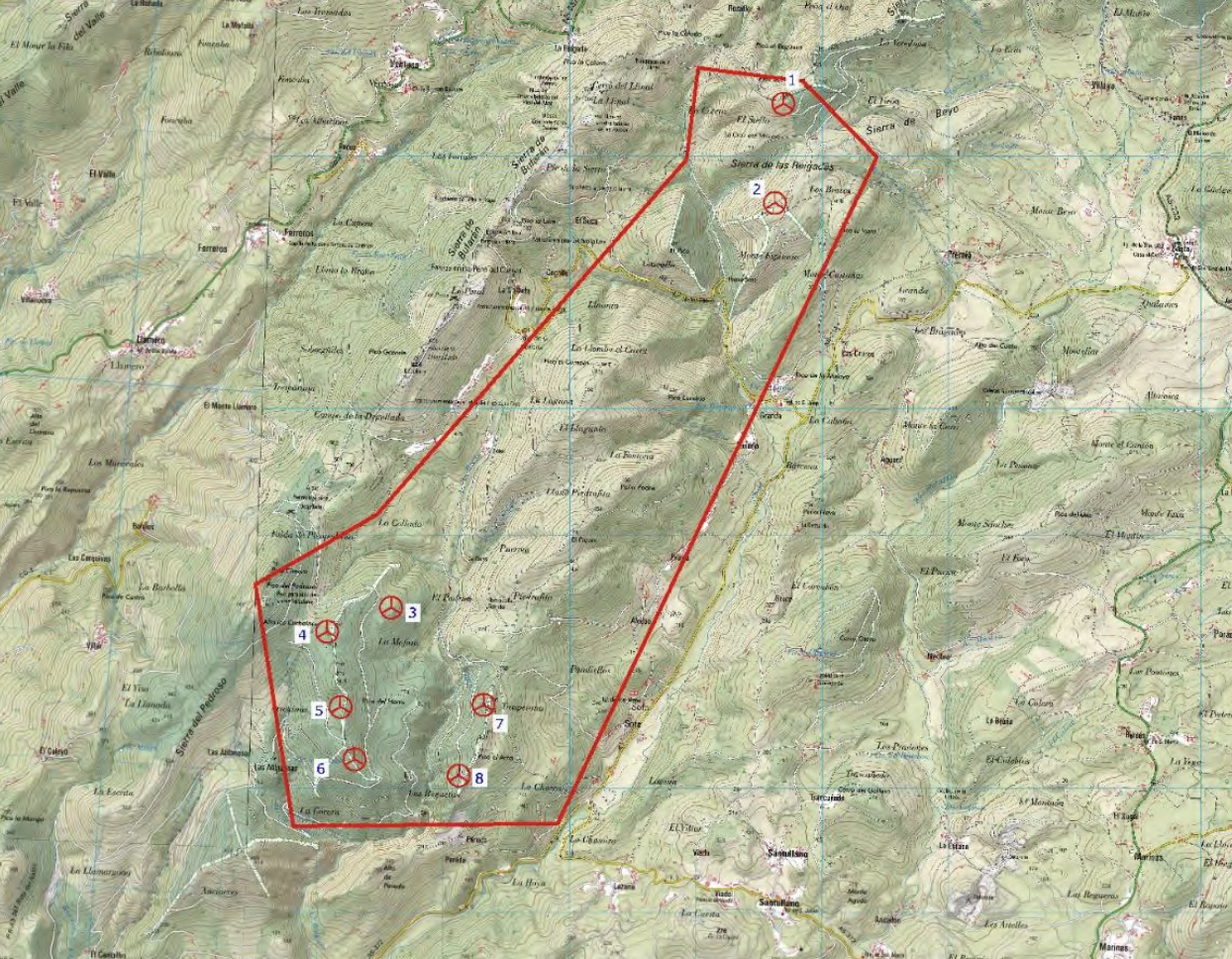 La Plataforma destaca que «el proyecto se ubica en un entorno que, según las Directrices Sectoriales de Ordenación del Territorio para el aprovechamiento de la energía eólica, aprobadas por el gobierno asturiano en 2008, está catalogado como “zona de baja capacidad de acogida”, donde solo se permiten instalaciones eólicas de pequeña entidad, y en ningún caso grandes centrales eólicas. Añaden que es una zona de potencial expansión de especies protegidas como el oso pardo, y un corredor de aves migratorias.