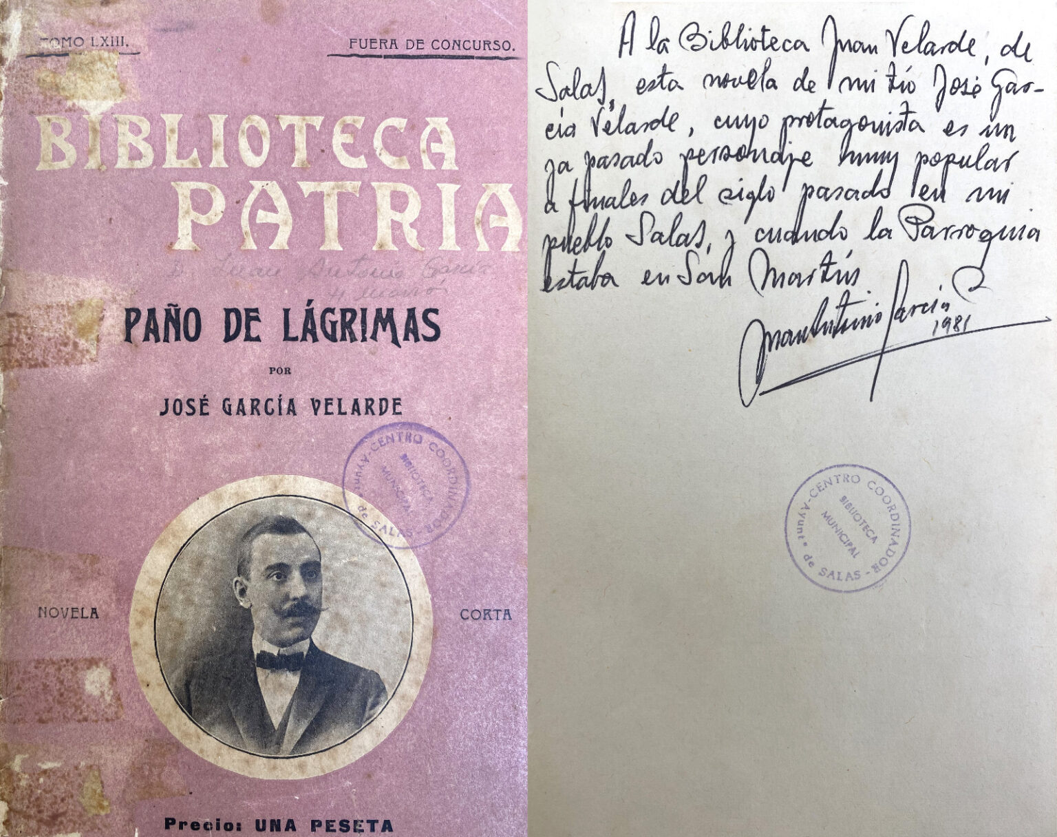 En el verano de 2025 el editor de Prámaro, Javier F. Granda, colaborador de LA VOZ DEL TRUBIA, encontró, por casualidad, sobre una mesa de la Biblioteca Municipal de Salas, la obra ‘Paño de Lágrimas’, de José García Velarde, publicada fuera de concurso por Biblioteca Patria, en 1909. Se trata de una novela corta, finalizada en diciembre de 1907, como queda indicado en la edición rústica. El ejemplar disponible en la biblioteca lleva la signatura R.6034 y está dedicado por un sobrino del autor en 1981.