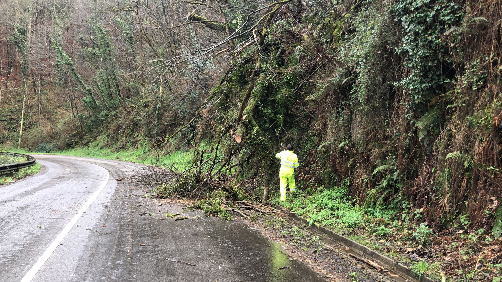 Troncos de árbol que amenazan como lanzas a los coches, en ocasiones sostenidos tan sólo por un cable del tendido eléctrico. Ramas en la carretera ante cualquier episodio de lluvia o viento, y árboles caídos sobre los carriles, no una ni dos veces. Los últimos episodios, esta misma semana, con dos árboles desplomados sobre la carretera en dos días, afortunadamente sin causar víctimas, Estos son los alarmantes avisos que lleva años dando el tramo conocido como la canal de Berció, en la carretera nacional N-632, la ‘vieja’ entre Trubia y Grado. El tramo afecta también a la localidad trubieca de Udrión, ya en el concejo ovetense, y su peligrosidad ha sido denunciada en numerosas ocasiones sin que se hayan tomado cartas en el asunto. El alcalde de Grado, José Luis Trabanco, visitó hace unos años la zona, acompañado de técnicos municipales, para pedir medidas efectivas que eviten el evidente riesgo. Años después, la situación sigue igual. La seguridad de la carretera es competencia del Ministerio, y de hecho cuando se cae un árbol, como ocurrió esta mañana, el aviso se pasa al 112, como hizo el concejal de Obras moscón, José María González Beovídez, ya que el concejo no tiene competencias en esta carretera. Es quizá esa falta de competencias, y el hecho de que sea un tramo compartido entre dos concejos, Oviedo y Grado, lo que dificulte que se tomen medidas efectivas antes de que ocurra una desgracia.